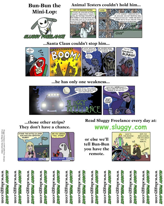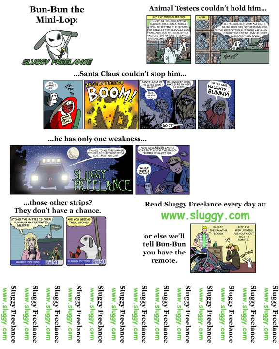 A while ago (around 2000?) Pete and company had a contest for fans to make posters that could be put up to advertise Sluggy. Here is the one that I made for that contest, along with others made afterward. Print them out and put them up all over!